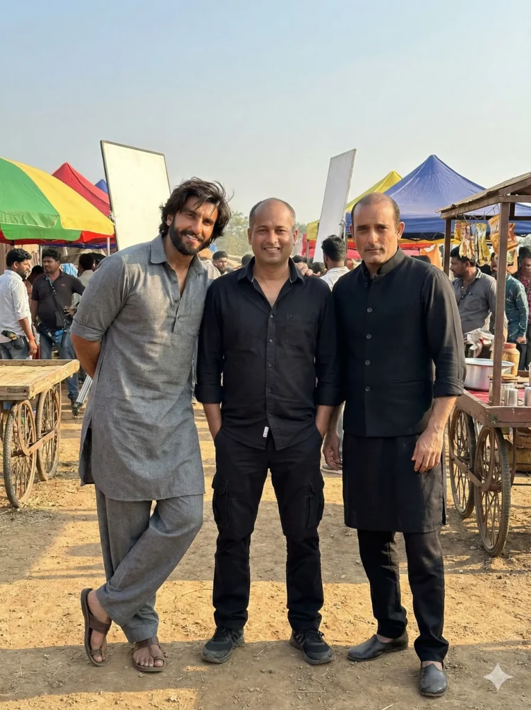 A natural daytime cinematic photo showing the user between Bollywood Actor Ranveer Singh and Akshaye Khanna. on the shooting stage of the film “Dhurender”.